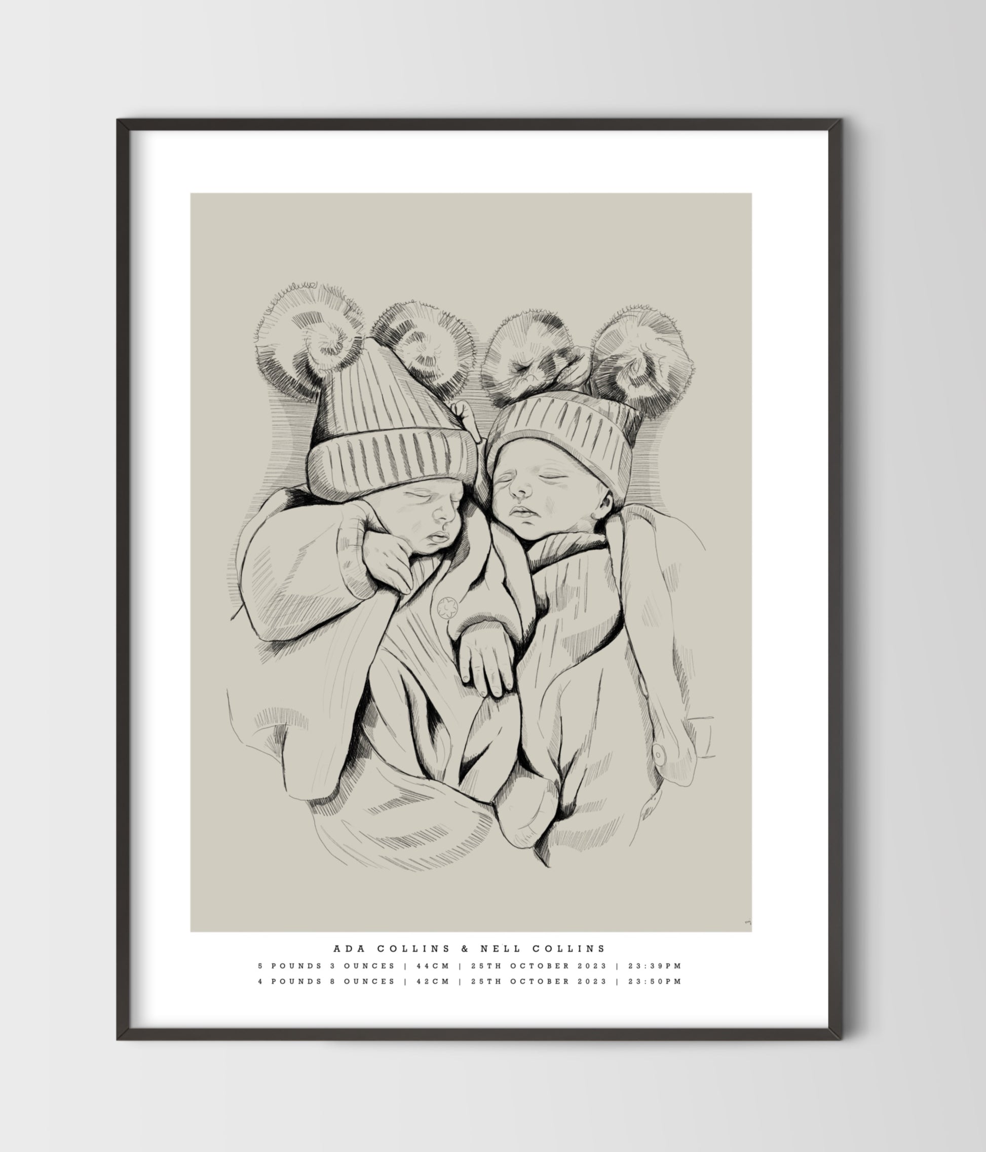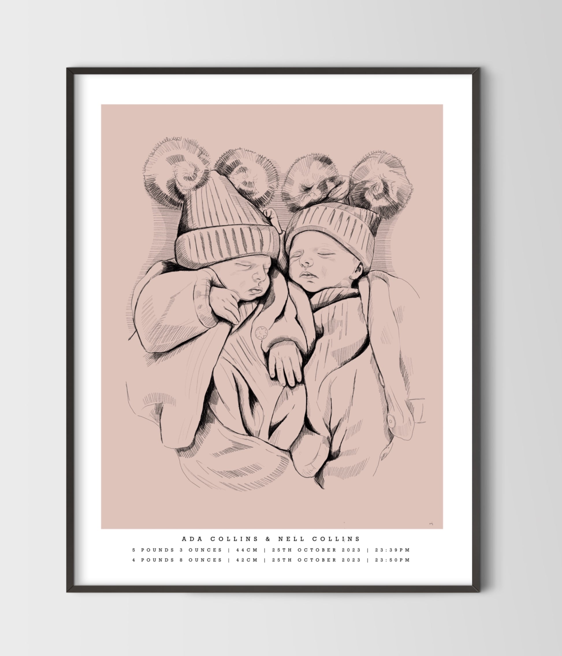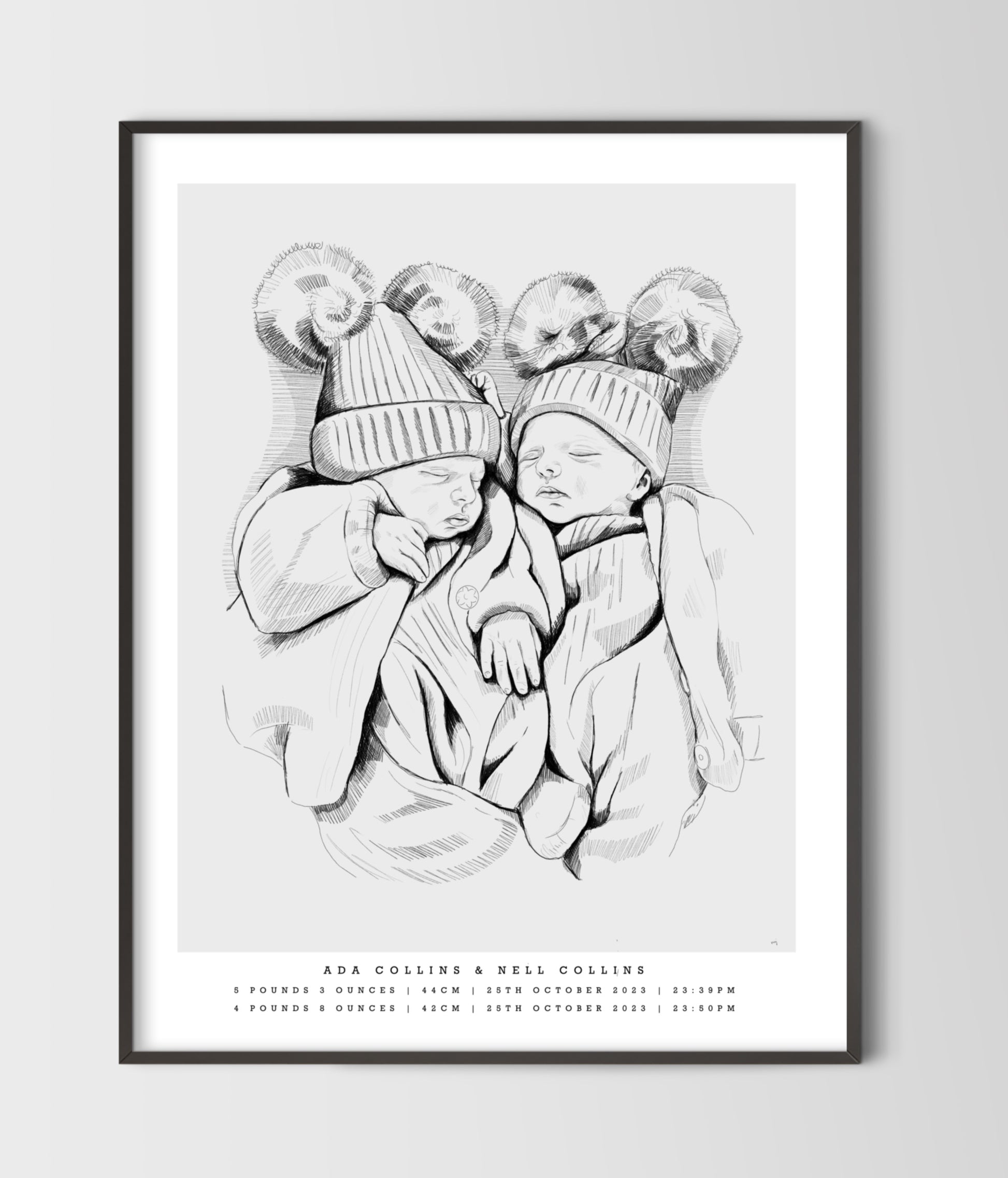 A unique custom hand-drawn birth poster of your newborn baby. Drawn from a photograph of your little one, each baby poster is created to ensure a truly one-of-a-kind keepsake. Order your own unique birth poster today!