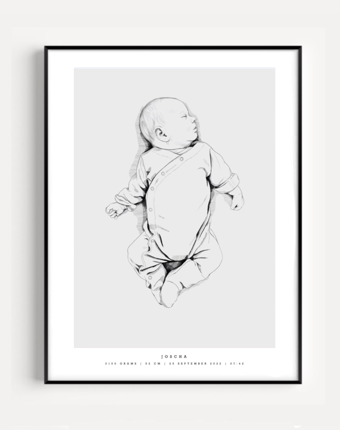 A unique custom Hand-drawn illustration of your newborn baby in its birth length in scale 1:1. Drawn after a photograph of your little one, each baby poster is created to ensure a truly one-of-a-kind keepsake.