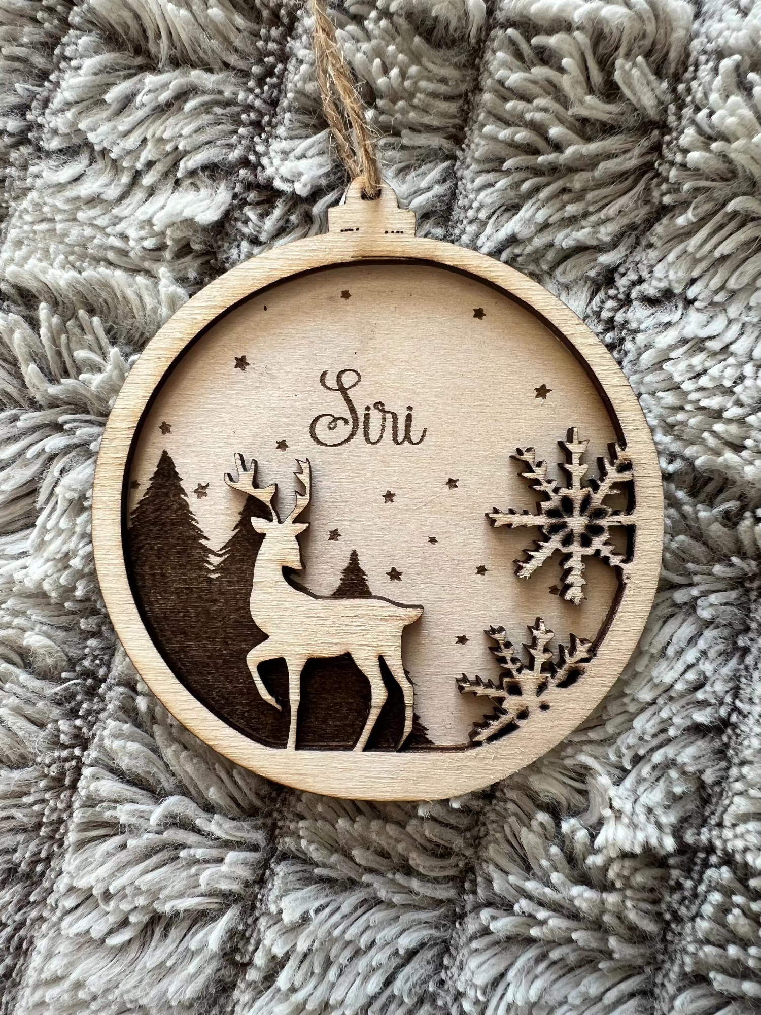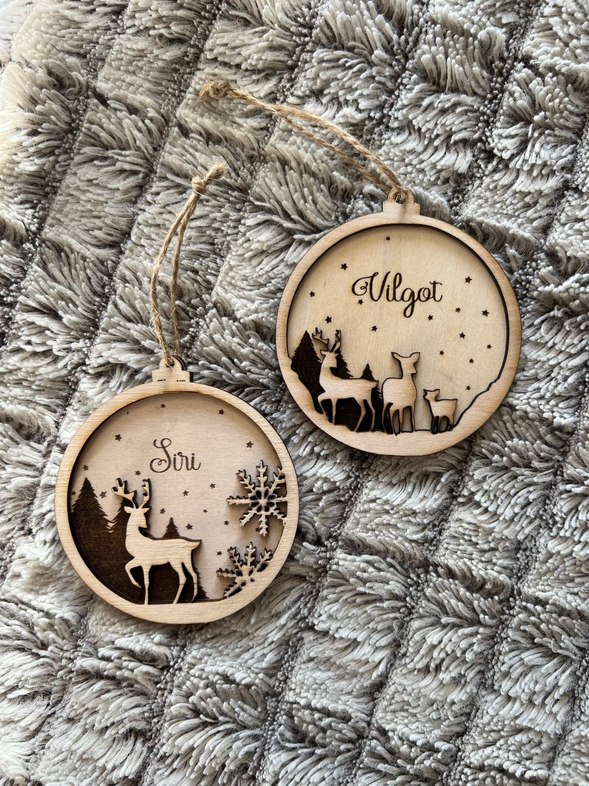 Beautiful Christmas tree decorations. Made from high-quality wood with a personalized engraved name, and optionally, a small message above the name with "Merry Christmas" or "God Jul." These decorations measure 9.5 cm x 8.5 cm. A perfect Christmas gift for someone you care about.