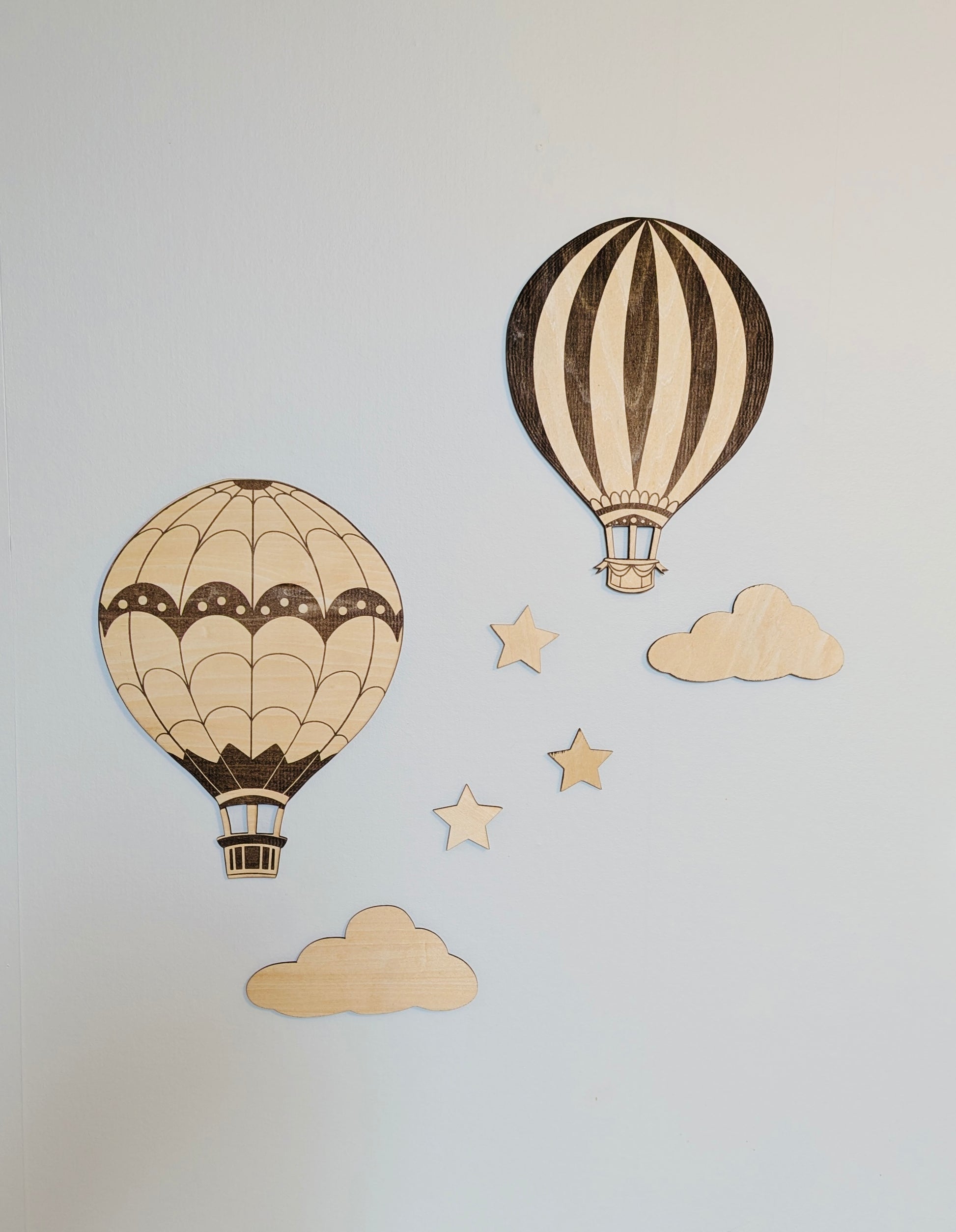 Wall decorations made from high-quality European birch plywood. This set includes three stars, two clouds, and two balloons (26 cm and 24 cm tall). Easily attachable with double-sided tape or adhesive putty, these decorations add a playful and inviting touch to any room. Perfect for nurseries, living rooms, or offices, their elegant design and natural wood grain bring a warm and modern feel to your space.