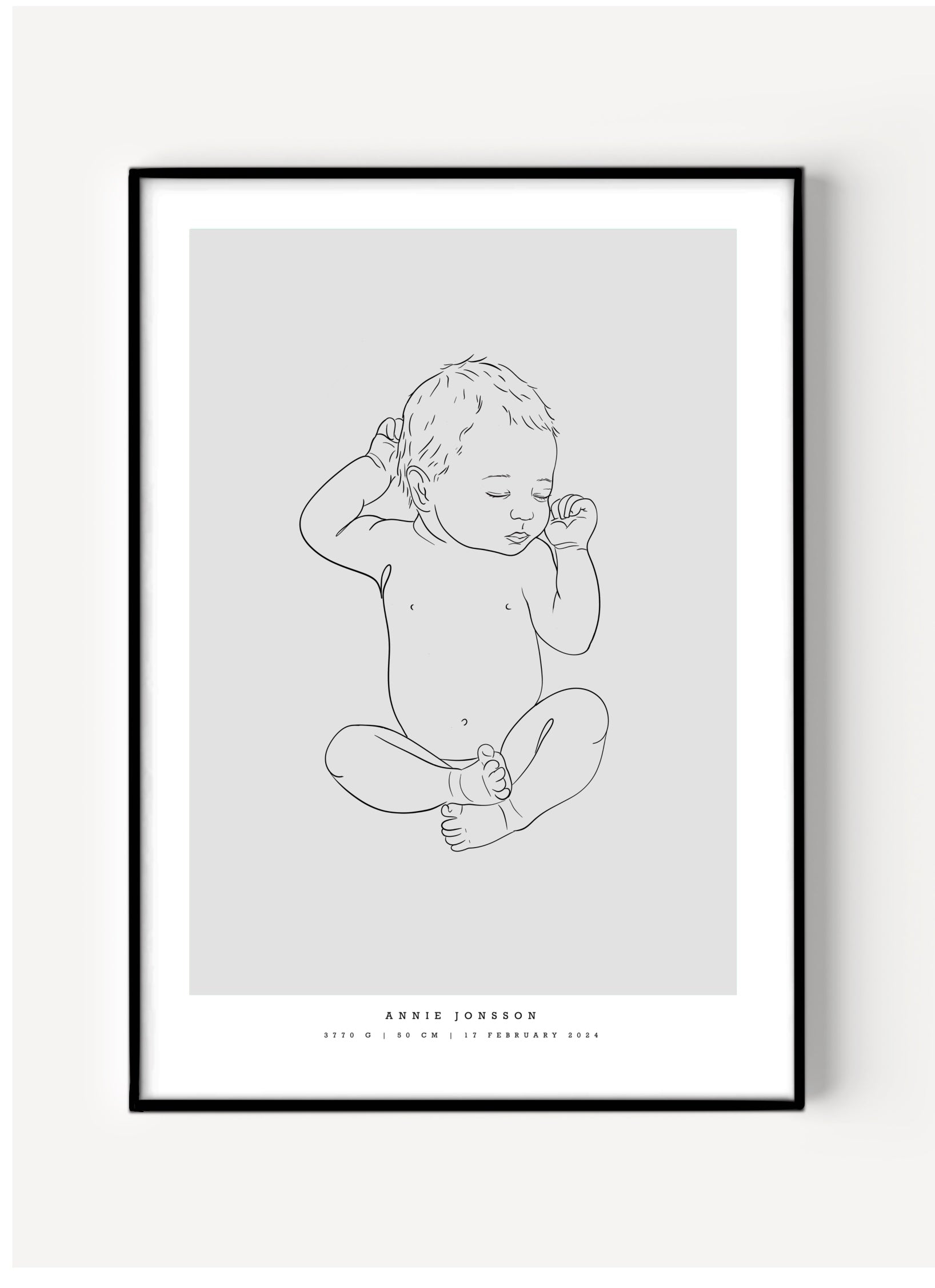 Designed to print in size 50x70 cm (19.7” x 27.5”) – a common frame size and perfect for displaying your baby at 1:1 scale